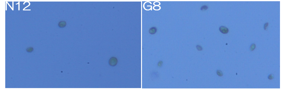 不鮮明な写真でもピレノイドがはっきりと確認できるクロレラですが、N12の方が丸く、G8が楕円のように見えます。