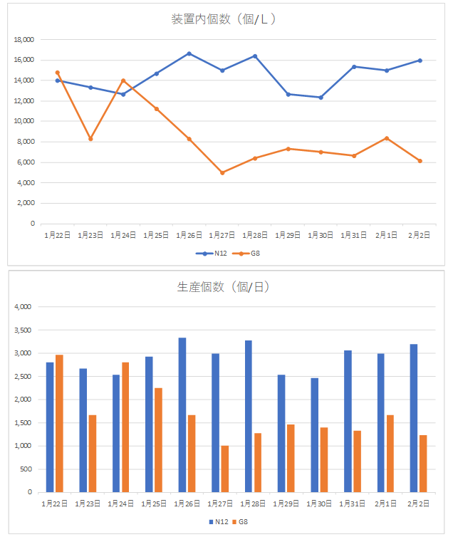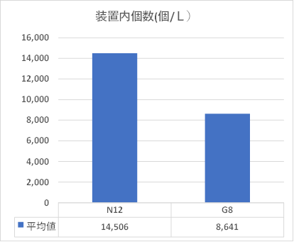 上の装置内個数の結果は、N12が高めで安定していたのに対し、G8は、初めはN12と同じであったのに徐々に低下し、低めで安定してしまいました。